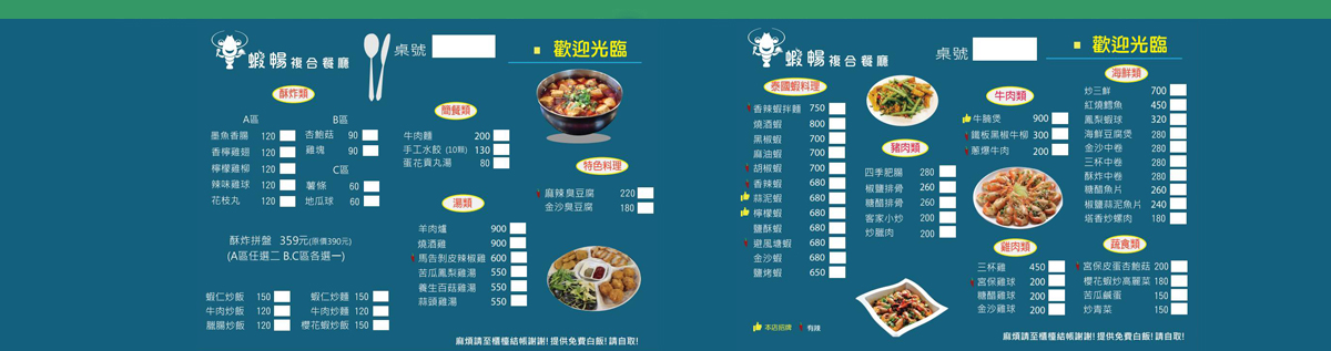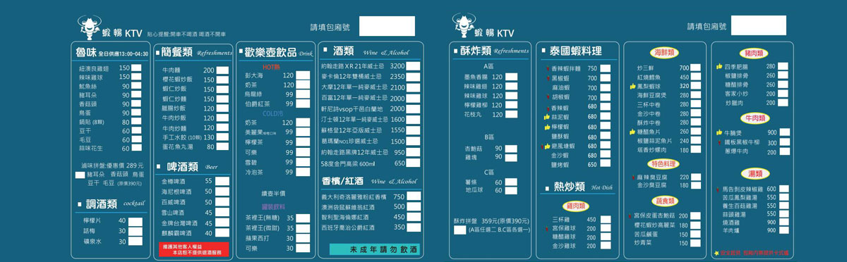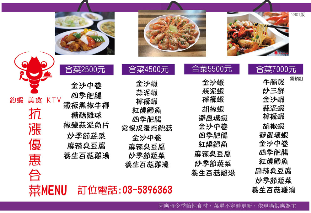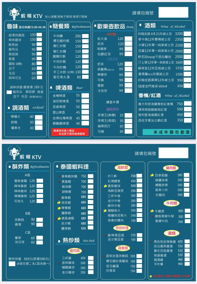 蝦暢菜單 ※一樓釣蝦 / 餐廳 餐廳菜色多樣化可供參考,歡迎各單位公司行號包場 (了解更多詳細內容,請點此了解) ※2樓KTV 菜單 / 熱炒供應時間17:00-22:30 消費方式介紹(了解更多詳細內容,請點此了解) ※合菜菜單